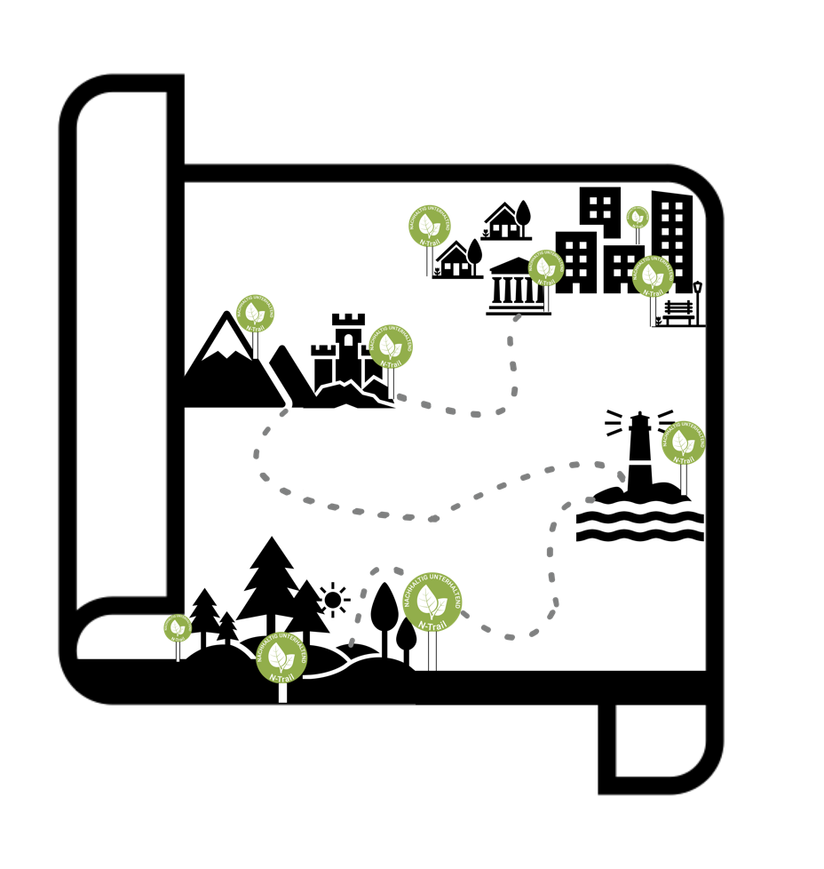 N-Trail Posten können als Themenpfad aufgebaut werden, bei denen die Teilnehmenden von Posten zu Posten geführt werden und die Inhalte aufeinander aufbauen (Bild links). Dies ist sinnvoll, wenn ein bestimmtes Thema im Vordergrund steht, bei z.B. Rundwegen oder Wegführungen von einem bestimmten Startpunkt zu einem Zielort. Zum Beispiel könnte ein N-Trail von einem Bahnhof zu einem Museum, einem Park oder einer Sehenswürdigkeit bereits Inhalte erlebbar machen, die thematisch mit dem Zielort verbunden sind. Dadurch wird ein Mehrwert für den Besuch des Zielorts geschaffen und gleichzeitig wird die Anreise mit öffentlichen Verkehrsmitteln attraktiver gestaltet.