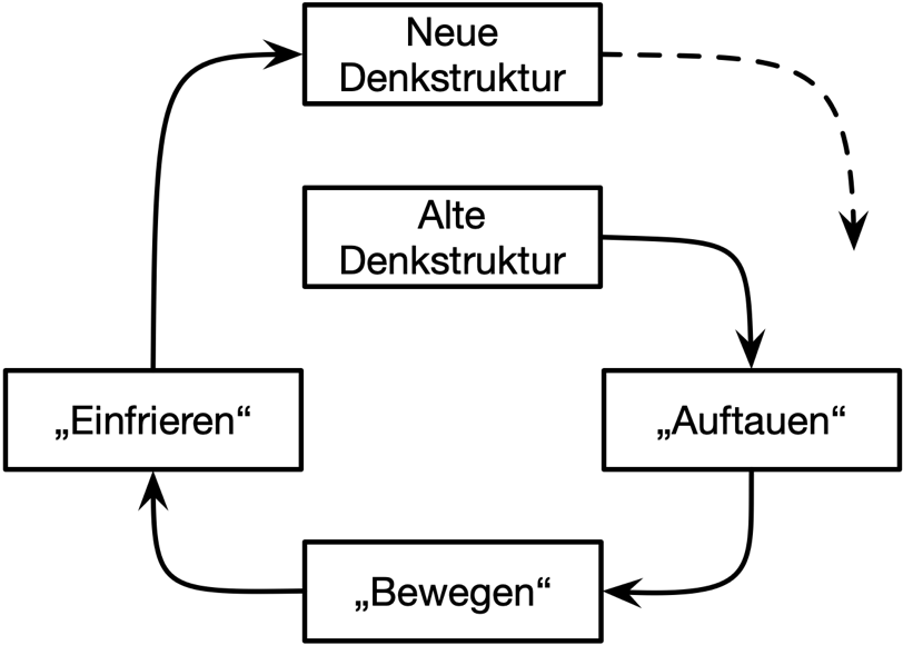Bisheriges, „altes“ Denken wird durch neue Informationen aufgetaut, dann durch neue Erfahrungen ergänzt, erweitert oder revidiert („bewegt“) und durch erfolgreiche Anwendung wieder „eingefroren“, so dass eine neue Denkstruktur entsteht, die „funktionaler“ als die vorherige Struktur ist. Eine „Evolution“ des Denkens.
