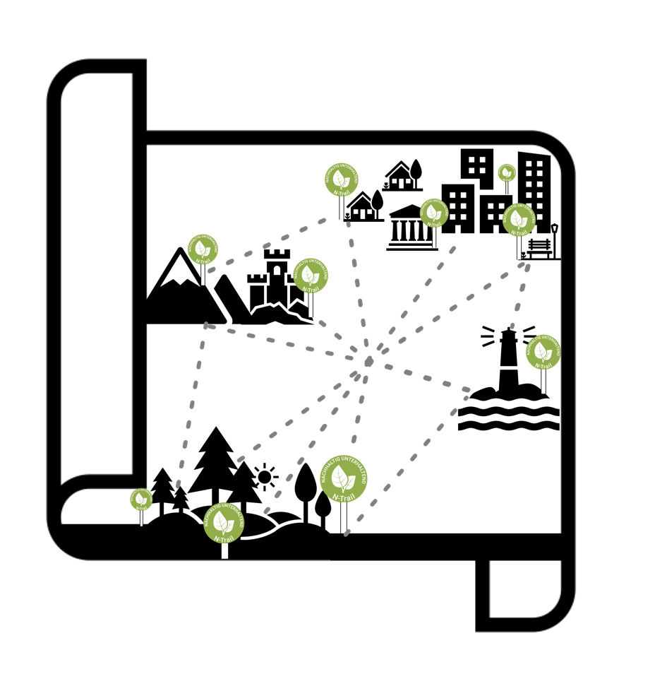 N-Trail Posten können als Themenpfad aufgebaut werden, bei denen die Teilnehmenden von Posten zu Posten geführt werden und die Inhalte aufeinander aufbauen (Bild links). Dies ist sinnvoll, wenn ein bestimmtes Thema im Vordergrund steht, bei z.B. Rundwegen oder Wegführungen von einem bestimmten Startpunkt zu einem Zielort. Zum Beispiel könnte ein N-Trail von einem Bahnhof zu einem Museum, einem Park oder einer Sehenswürdigkeit bereits Inhalte erlebbar machen, die thematisch mit dem Zielort verbunden sind. Dadurch wird ein Mehrwert für den Besuch des Zielorts geschaffen und gleichzeitig wird die Anreise mit öffentlichen Verkehrsmitteln attraktiver gestaltet.
